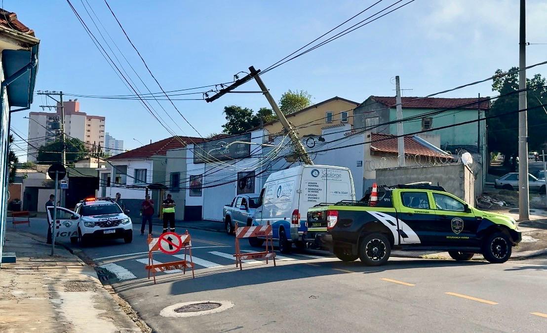 Queda de poste interdita totalmente a Rua Brasil após acidente com van em Jundiaí
