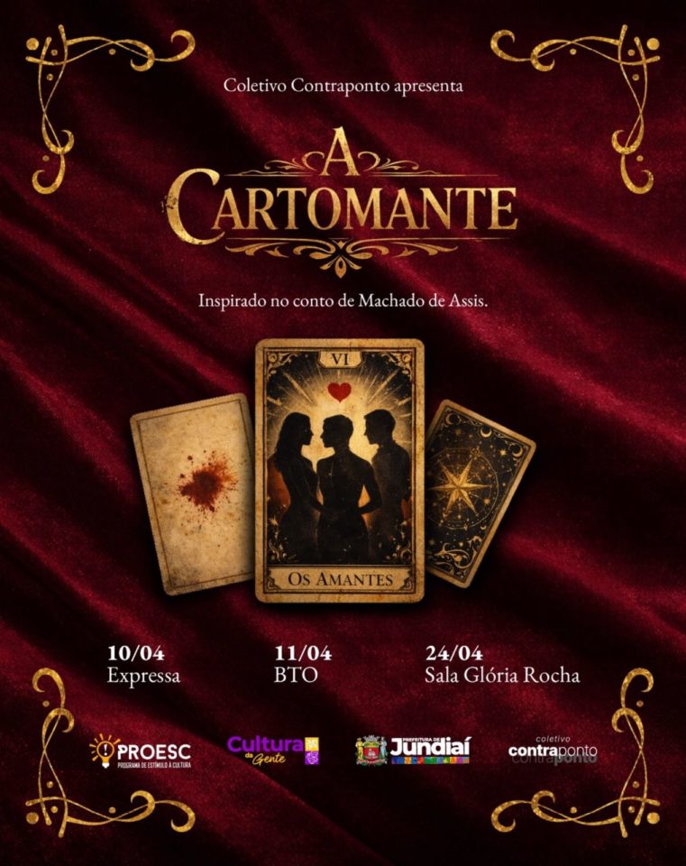 O espetáculo “A Cartomante”, do Coletivo Contraponto, chega a Jundiaí em abril com uma proposta que mistura dança contemporânea e teatro para revisitar um dos clássicos da literatura brasileira. Inspirada na obra de Machado de Assis, a montagem propõe uma reflexão atual sobre destino, desejo e comportamento humano. Criado e interpretado por Giovanna Baraldi e Ricardo Assumpção, o espetáculo apresenta a história de um triângulo amoroso marcado pela consulta a uma cartomante, que prevê o futuro dos personagens. A narrativa convida o público a questionar até que ponto o destino e o livre-arbítrio influenciam as escolhas e as relações humanas.